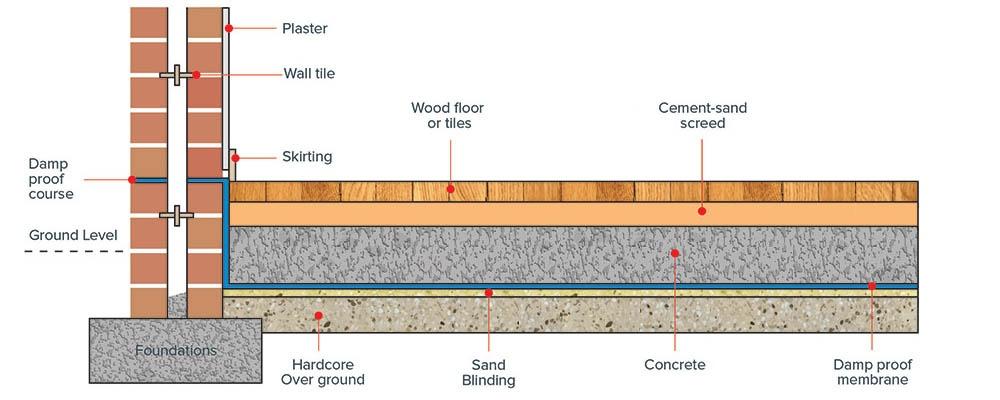 Rising damp is caused by ground water moving up through a wall or floor. It's natural for walls and floors to allow a little water in, but it’s usually stopped from causing damage by a barrier called a damp-proof course or damp-proof membrane (see image below).